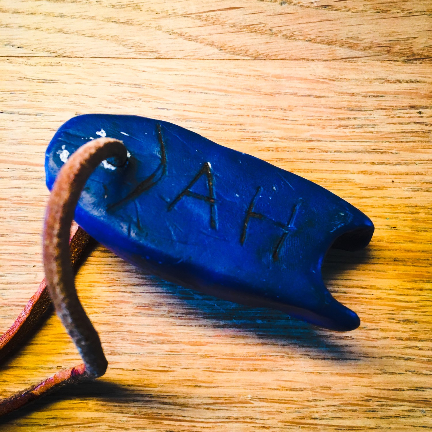 Auf der Rückseite hat der blaue Fisch ein paar Kratzer, die vermutlich schon beim Modellieren entstanden sind und in denen sich mit der Zeit etwas Staub angesammelt hat. Wenn ich den Fisch in die Hand nehme, fühlt er sich trotzdem glatt an. Die Aussparung am Fischschwanz ist genau so groß, dass ich meinen Zeigefinger hineinklemmen kann. Als ich den Fisch damals formte, habe ich die Aussparung mit dem Daumen in die Knetmasse gedrückt. Hinten an der Rückseite des Fisches ist im Gegenlicht auch der Fingerabdruck meines Daumens zu erkennen. Das Lederband, das durch den Kopf des Fisches gezogen ist, ist bis heute nicht brüchig geworden.