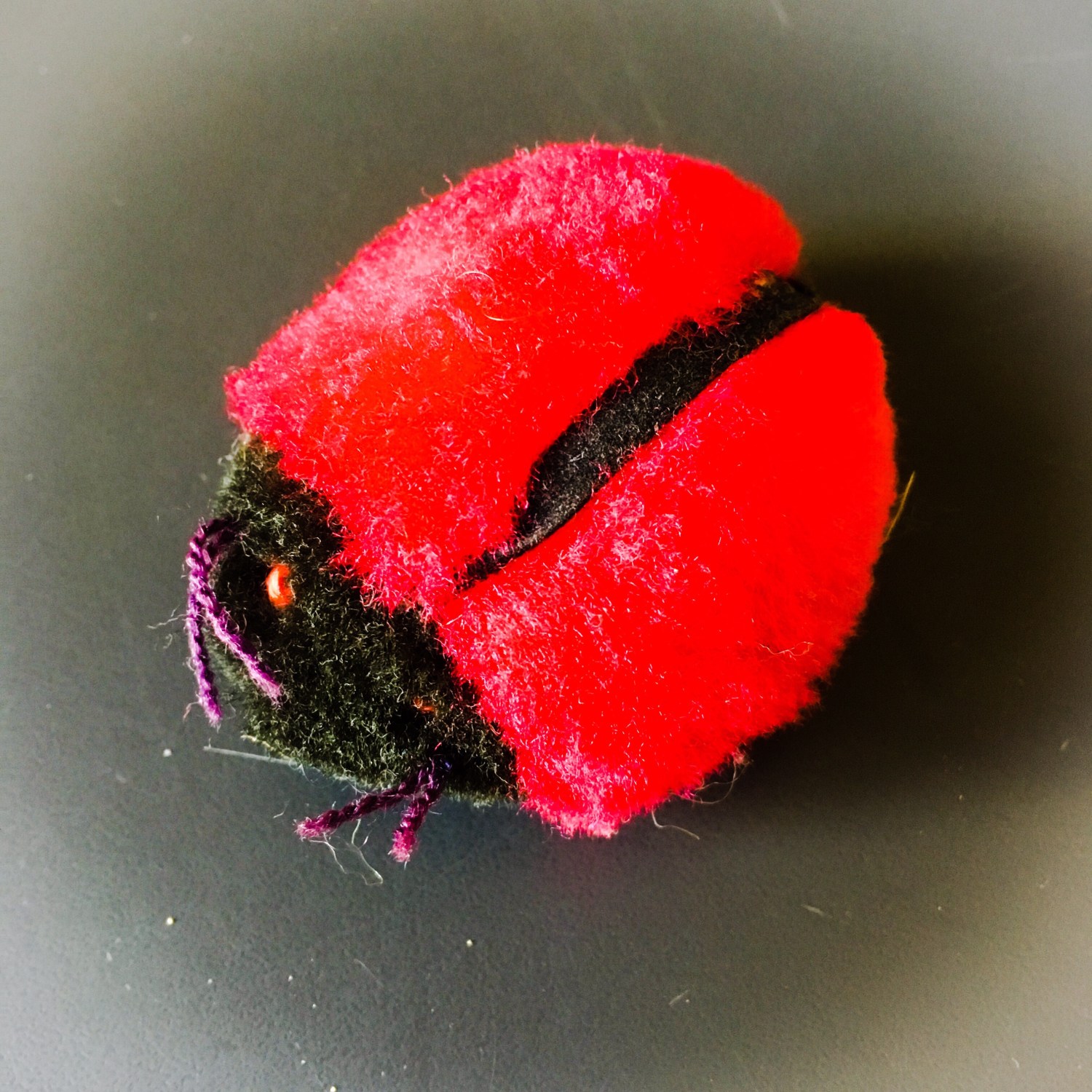 Dieser Marienkäfer stammt von einem Luftgewehrschießstand auf einem Weinmarkt in Mainz. Irgendwann in der zweiten Hälfte der 1990er Jahre schoss einer meiner Kollegen am Mainzer „Institut für Europäische Geschichte“ den Käfer und schenkte ihn mir. Damals hatte ich gerade mein allererstes eigenes Auto gekauft, einen quietschblaumetallicfarbenenen kleinen Peugeot. Der Marienkäfer bekam einen Platz auf der vorderen Ablage direkt links unter der Windschutzscheibe. Denselben Platz behielt er auch, als ich den kleinen blauen Peugeot in den frühen 2000er Jahren gegen einen silbermetallicfarbenen 206cc eintauschte.