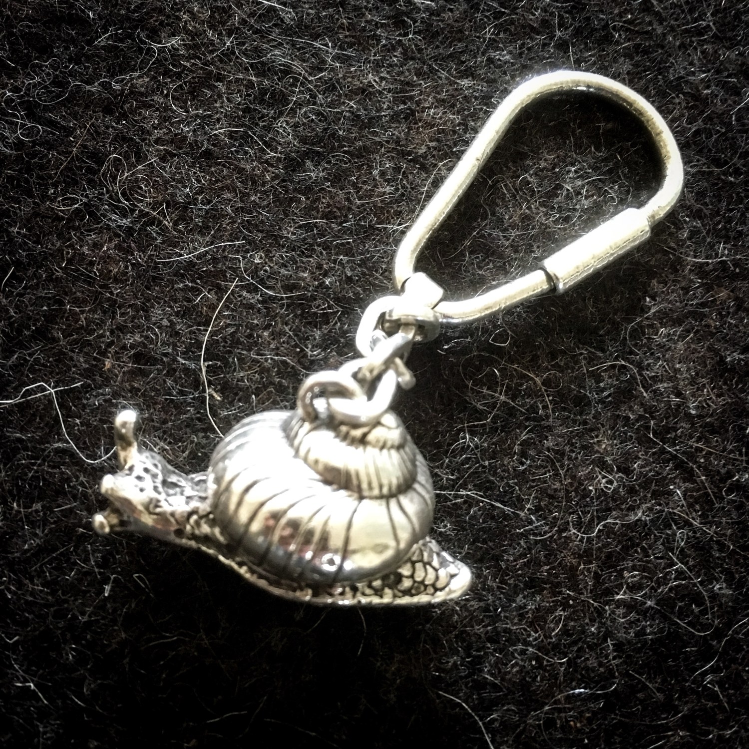 Die Schlüsselanhängermaus erwies sich über die Jahre als unpraktisch. Sie war einerseits zu leicht, um wirklich zuverlässig in der Tasche anzuzeigen, wo sich das Schlüsselbund gerade befand. Andererseits hatte sie mit Ohren, Ärmchen, Beinchen und Schwanz zu viele herausragende Enden, die sich in Taschenfuttern oder Reißverschlüssen verheddern konnten, so dass sie oft hängen blieb oder Löcher in Stoffe riss. Als ich in dem Mainzer Silberladen artgleiche Schlüsselanhänger entdeckte, freute ich mich daher sehr über die Gelegenheit, die Maus zu ersetzen. Zur Auswahl standen damals zahlreiche Anhänger in Form von Gegenständen, die Hobbies repräsentieren sollten: Golftaschen, Autos oder Tennisschläger. Dann gab es glücksverheißende Formen wie Herzen, Kleeblätter oder Schweine. Und es gab Tiere, von denen mir ein Frosch gefiel (den ich meiner Schwester schenkte) – und die Schnecke, die ich für mich selbst kaufte.