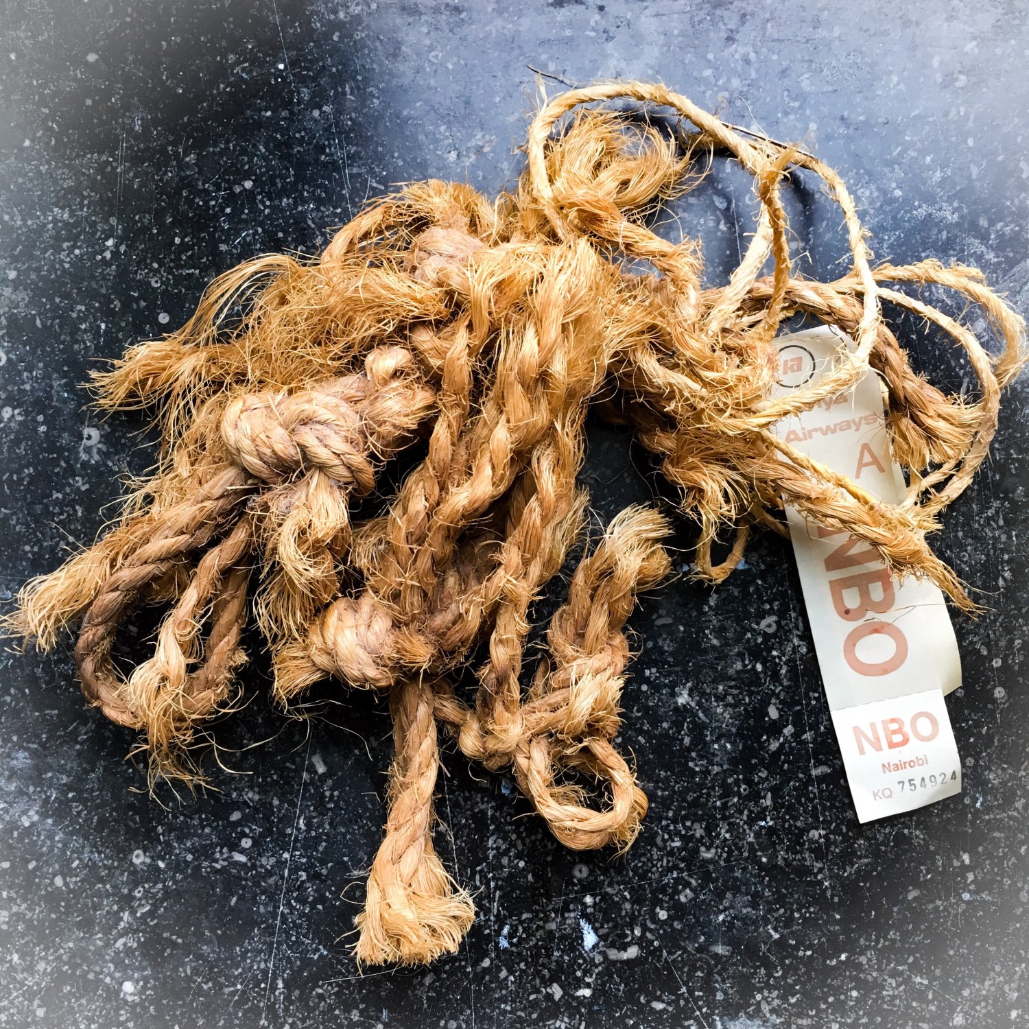 Dieses mehrfach gerissene und mehrfach wieder zusammengeknotete Seil diente meiner Mutter und mir bei einer Pflanzensammelexpedition in Kenia im Frühjahr 1987 erst als Abschleppseil und dann als Verschlussmechanismus für einen auf einem Flug aufgegebenen Sack mit überschüssigem Gepäck. Wie die geflochtenen Untersetzer, die wir irgendwann in den 1980er Jahren aus einem der von uns bereisten afrikanischen Länder mitbrachten, ist auch dieses Seil mit mir von Hamburg nach Marburg, von Marburg nach Mainz und dann wieder von Mainz nach Hamburg umgezogen. Bis heute liegt es auf einem Regal in unserem Wohnzimmer – ein bisschen zur Dekoration, und ein bisschen mehr zur Erinnerung.